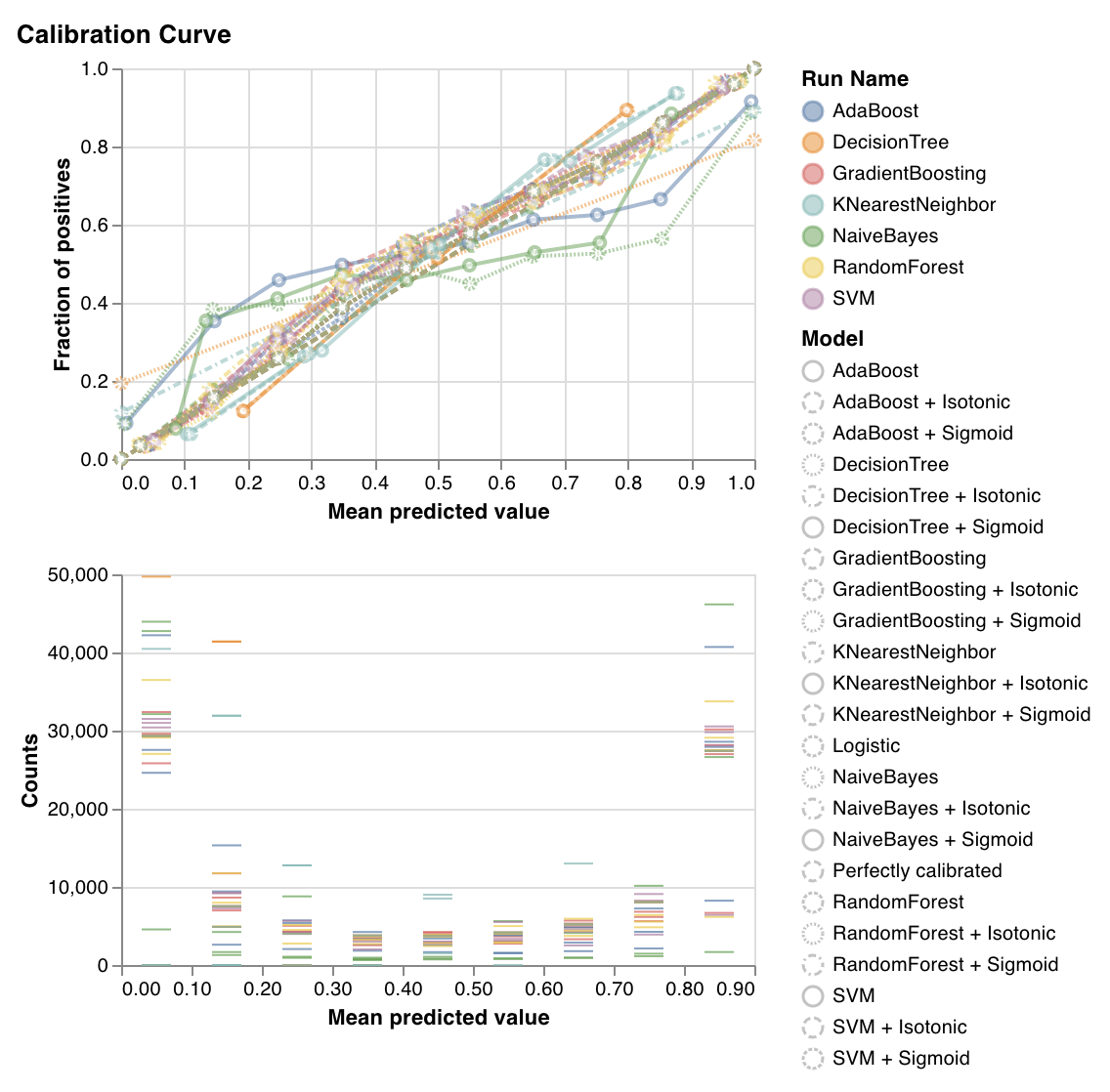 校正曲線が対角線に近いほど良いです。転置されたシグモイドのような曲線は過適応した分類器を表し、シグモイドのような曲線は学習不足の分類器を表します。モデルのアイソトニックおよびシグモイド校正をトレーニングし、それぞれの曲線を比較することで、モデルが過剰適合か学習不足かを判断し、どちらの校正(シグモイドまたはアイソトニック)が問題解決に役立つかを確認できます。
