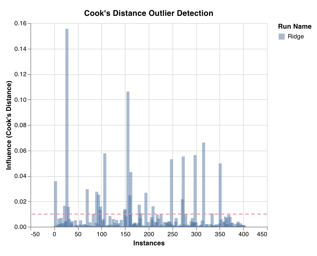 回帰モデルのクックの距離を使用してデータポイントの影響を測定します。影響が大きく偏ったインスタンスは異常値である可能性があります。異常値検出に役立ちます。