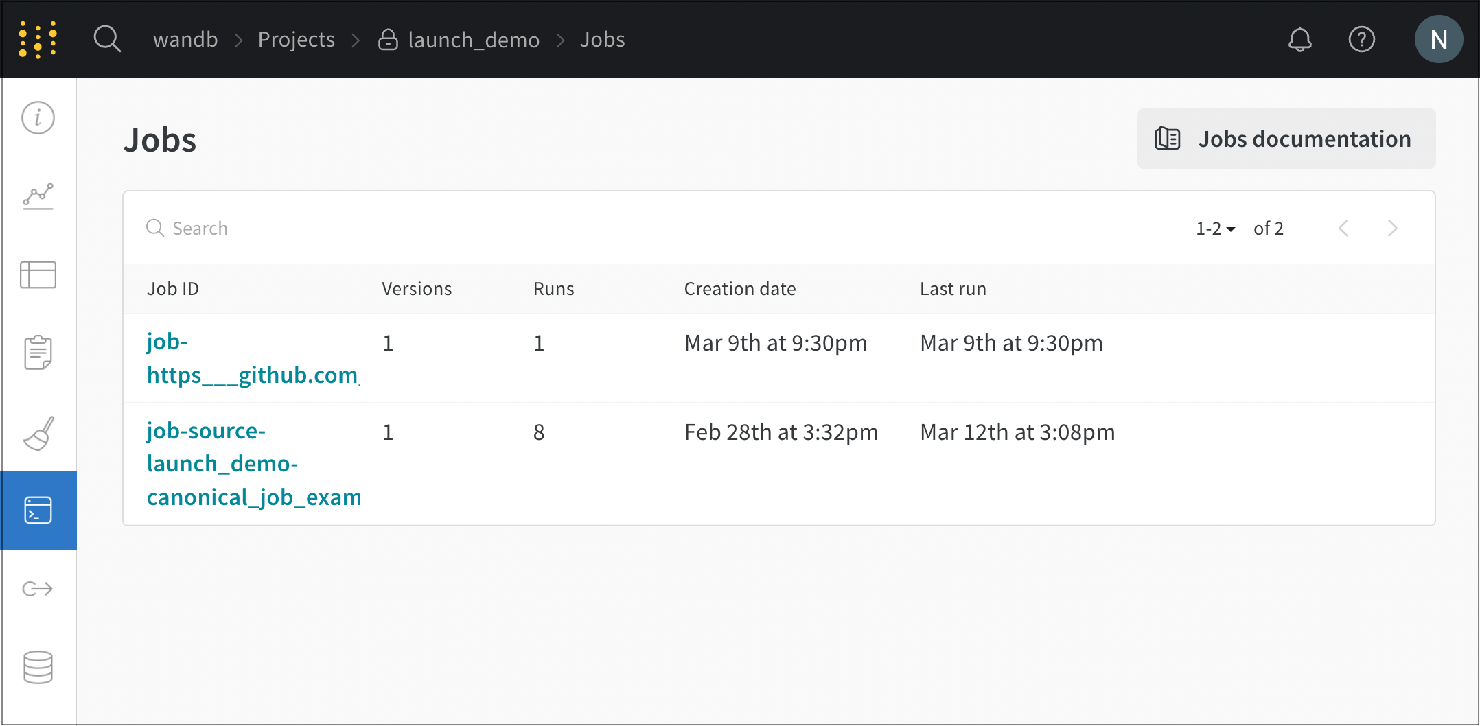 3. Jobs 페이지에는 이전에 실행된 W&B run에서 생성된 W&B Launch job 목록이 표시됩니다.